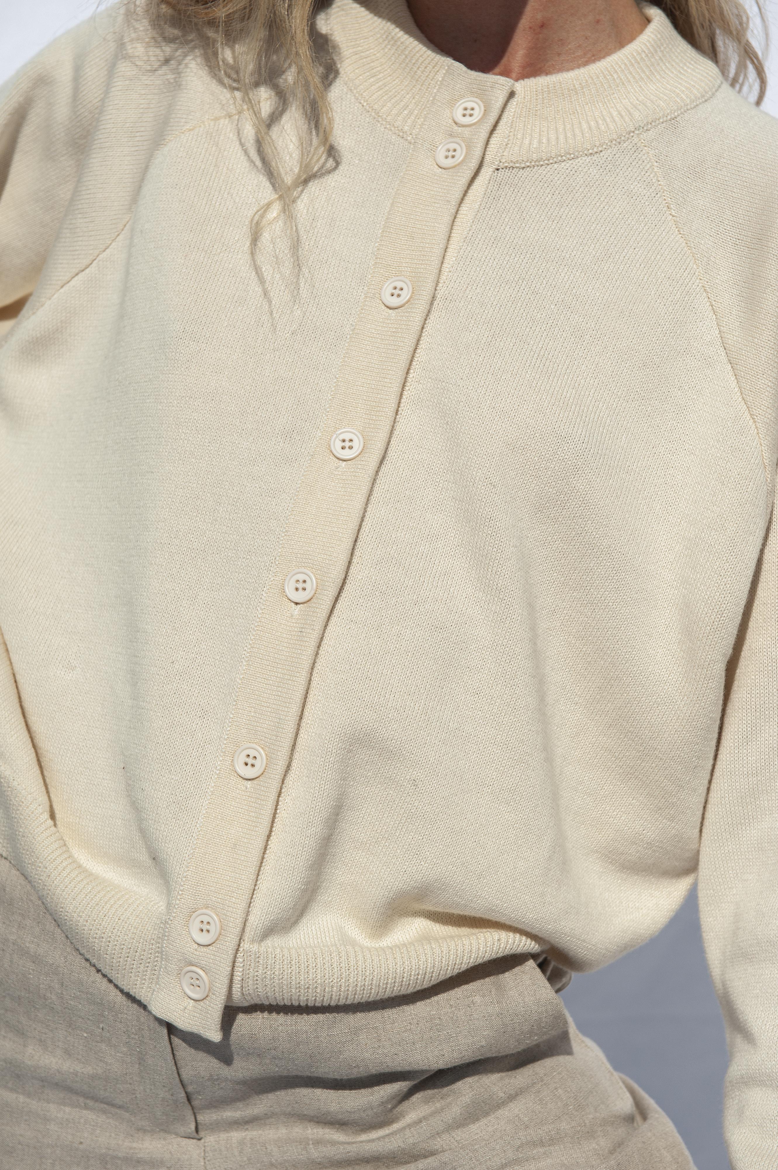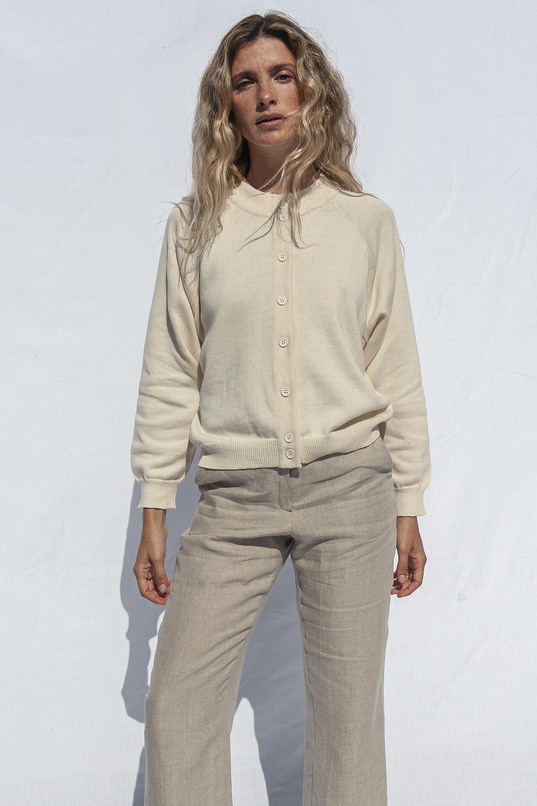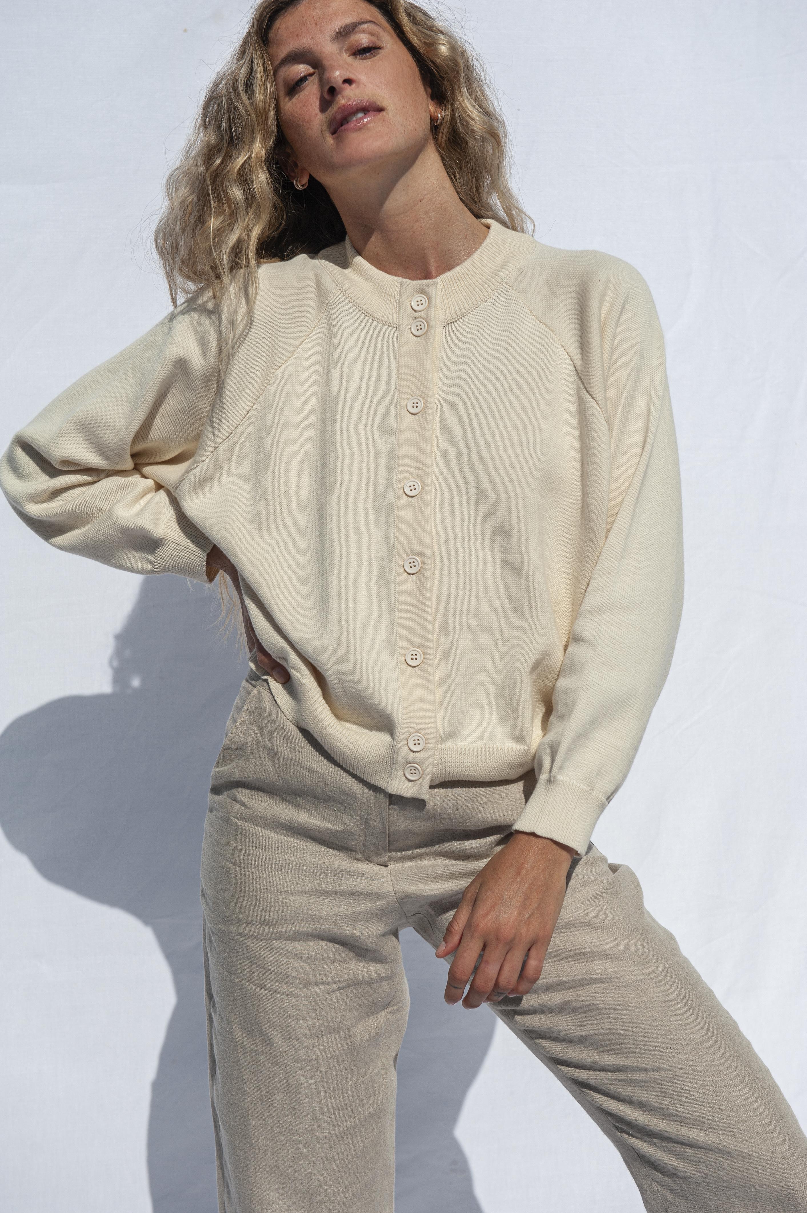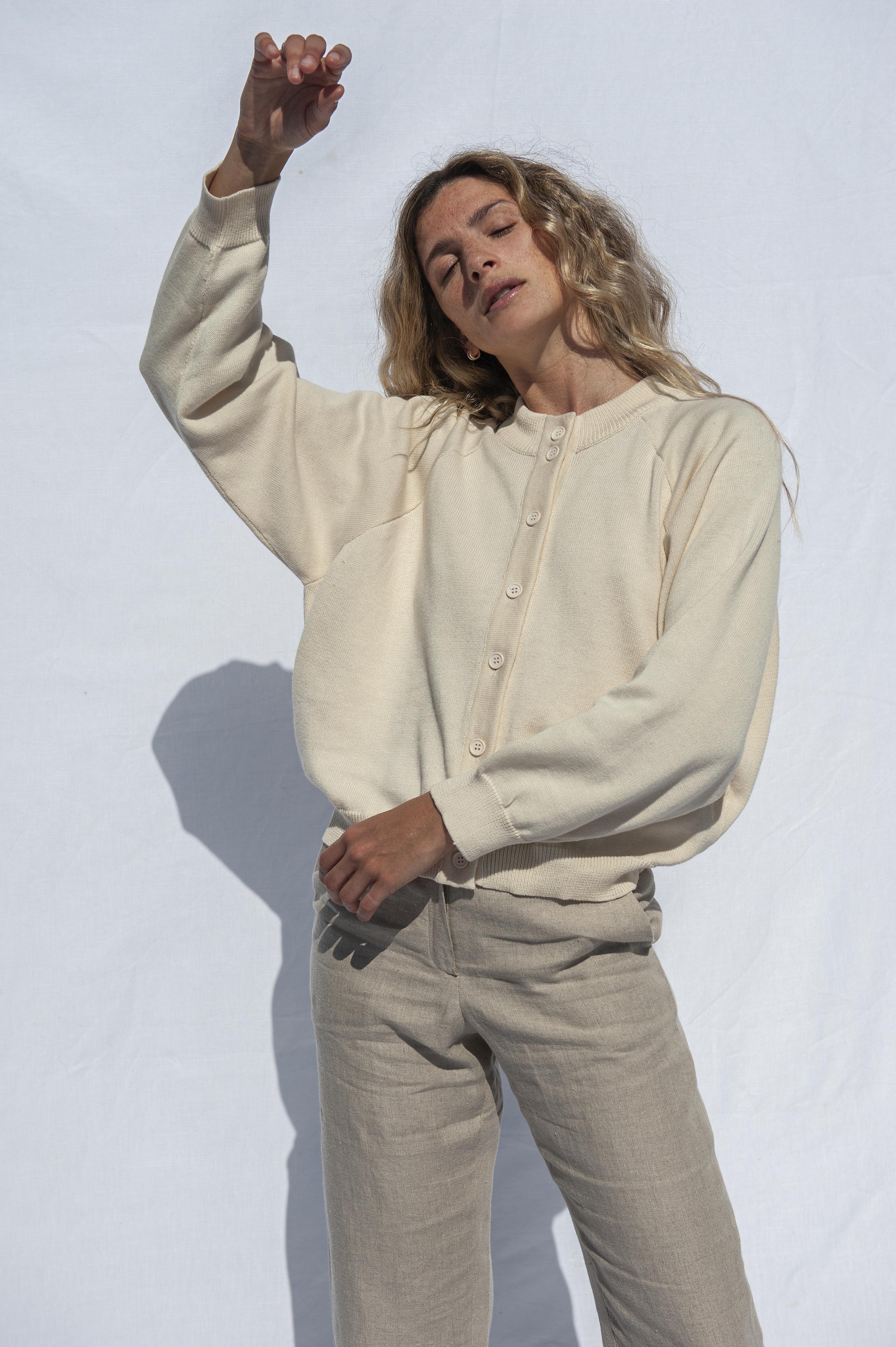 vibrant atmosphere. The Cardigan is offered in super soft organic cotton, features 4/5 sleeves, a high round neck, and playful buttons in the front. The seams that run diagonally from the armpits to the neckline, so-called raglan sleeves, give the Cardigan a pyramid shape optic. To make a full outfit of it, combine it with our cheeky Janet skirt.