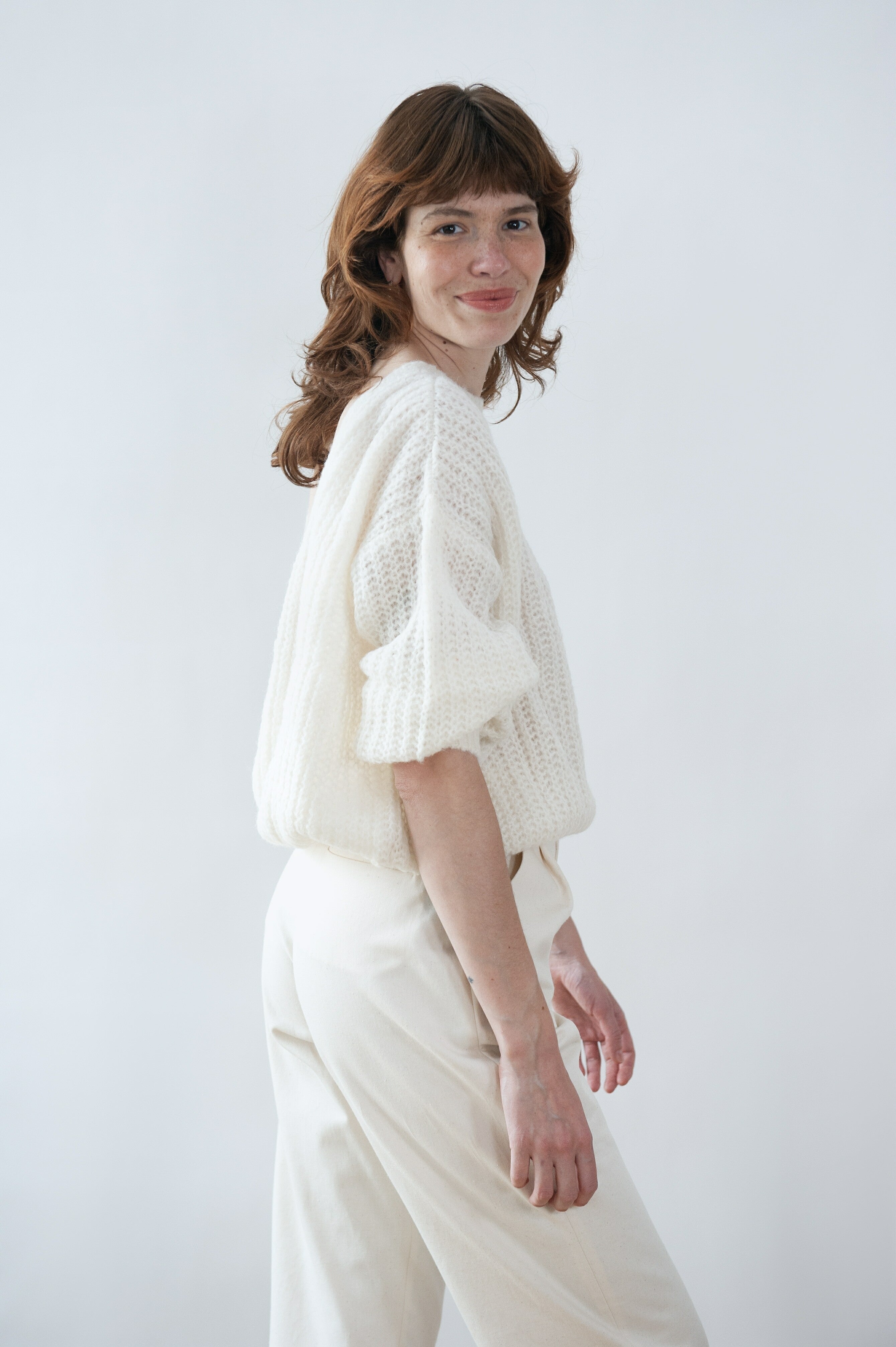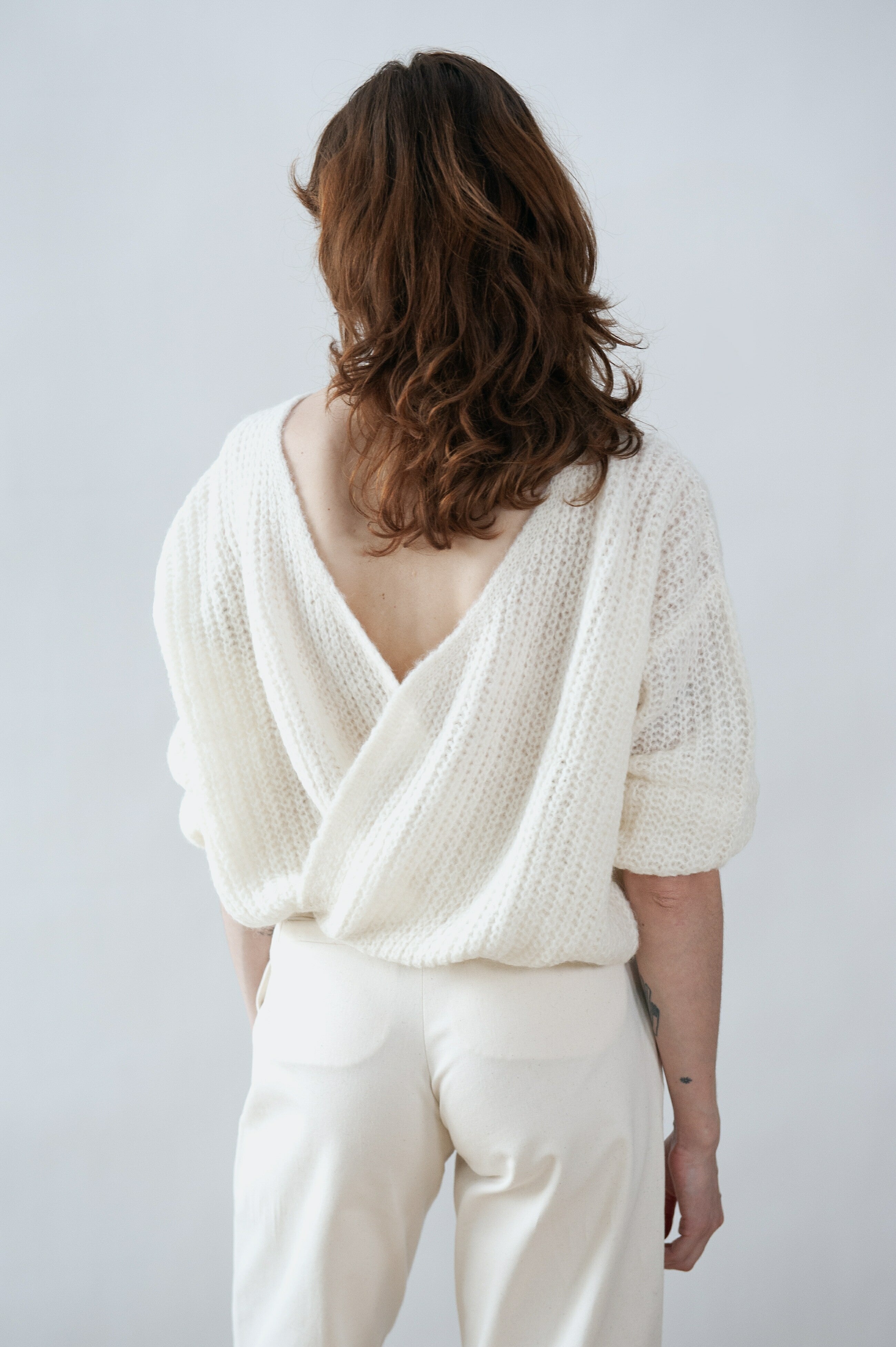 VEGA, our longtime high-flyer Wrap Cardigan with its unique design. It features the ingenuity of reversibility, offering a beautiful V neckline in the front or back. It has a loose fit, dropped shoulders, and balloon sleeves. With three nacre buttons at the lower hem you can choose the look to wear, an open or wrapped cardigan.