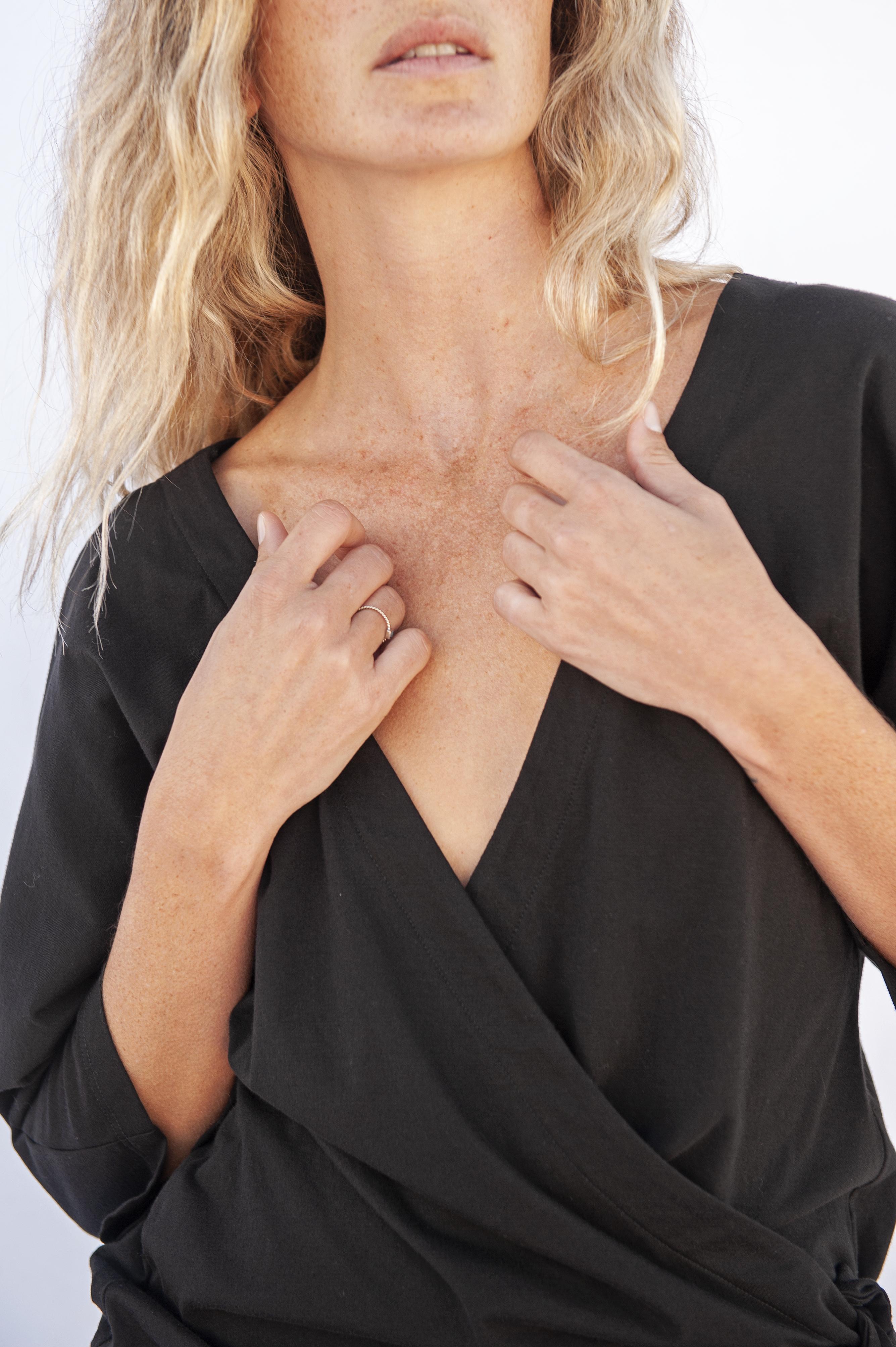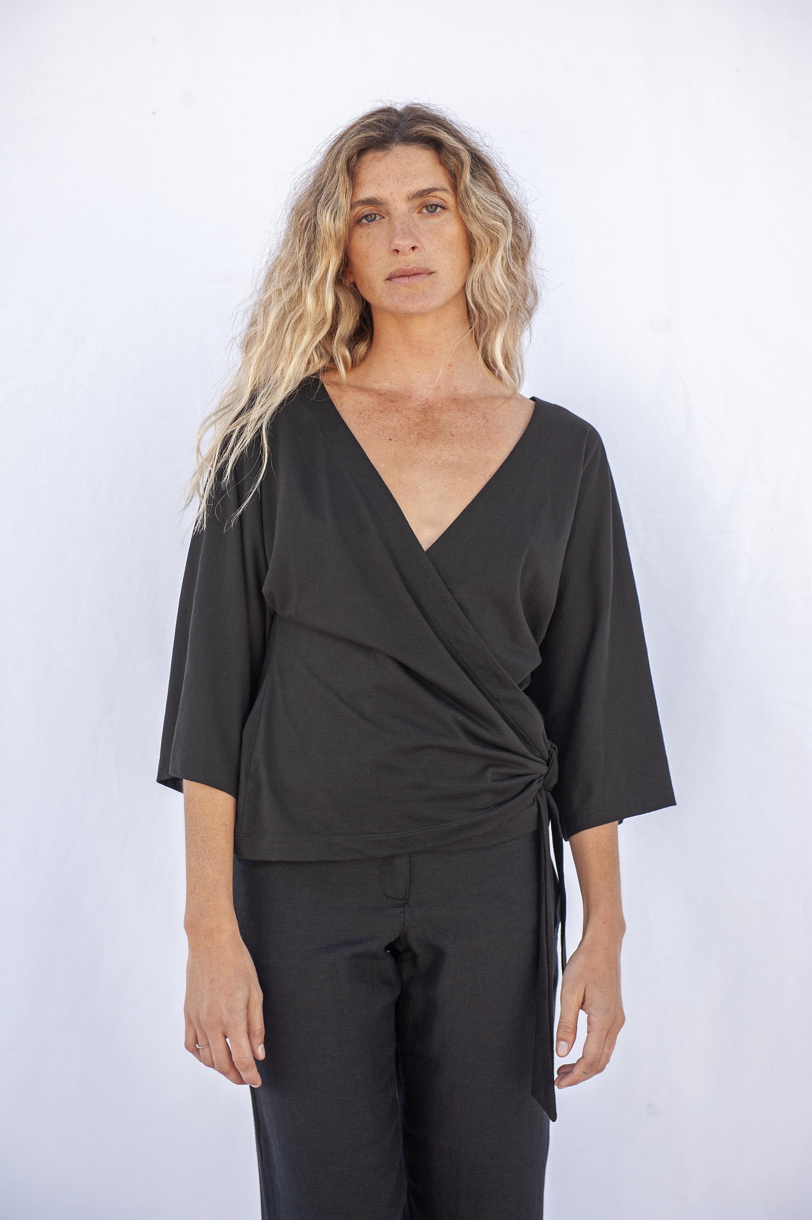 Meet MIA, the light and playful wrap top created to make you shine. Its reversible design lets you wear the elegant V-neckline in the front or back. The mid-length sleeves and adjustable waist belt let you style it your way. The high-quality Pima cotton makes the top durable and most comfortable.