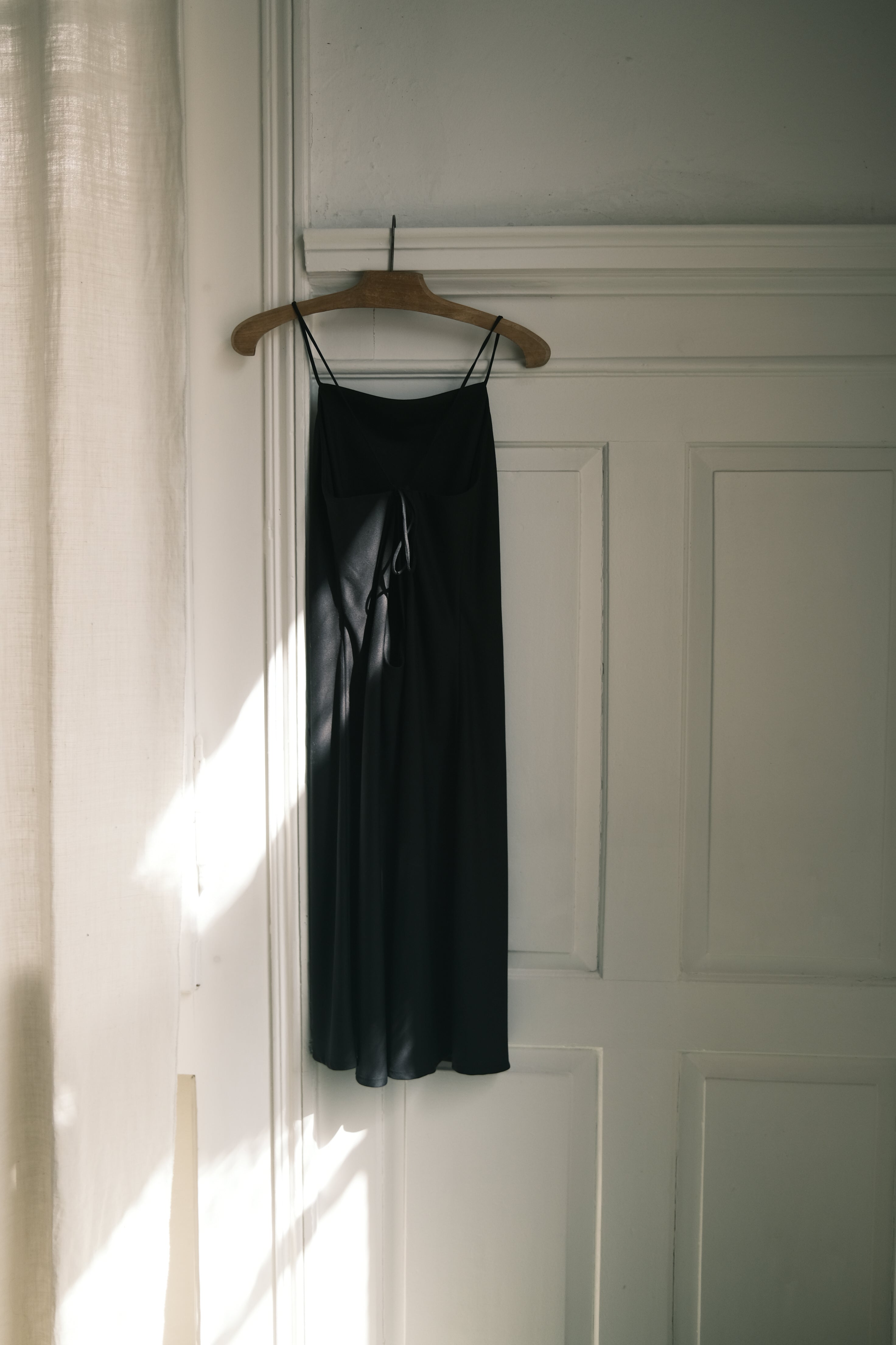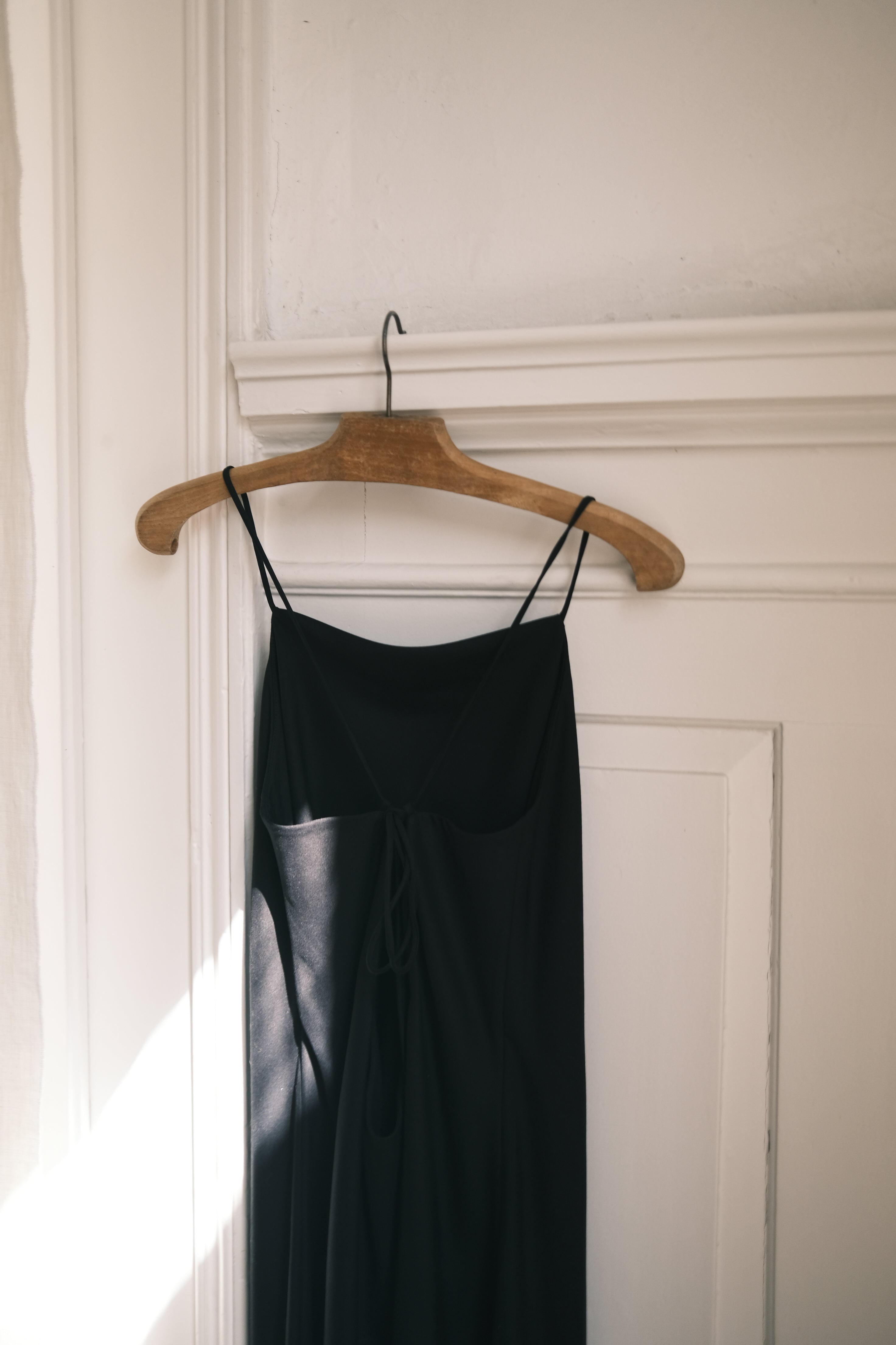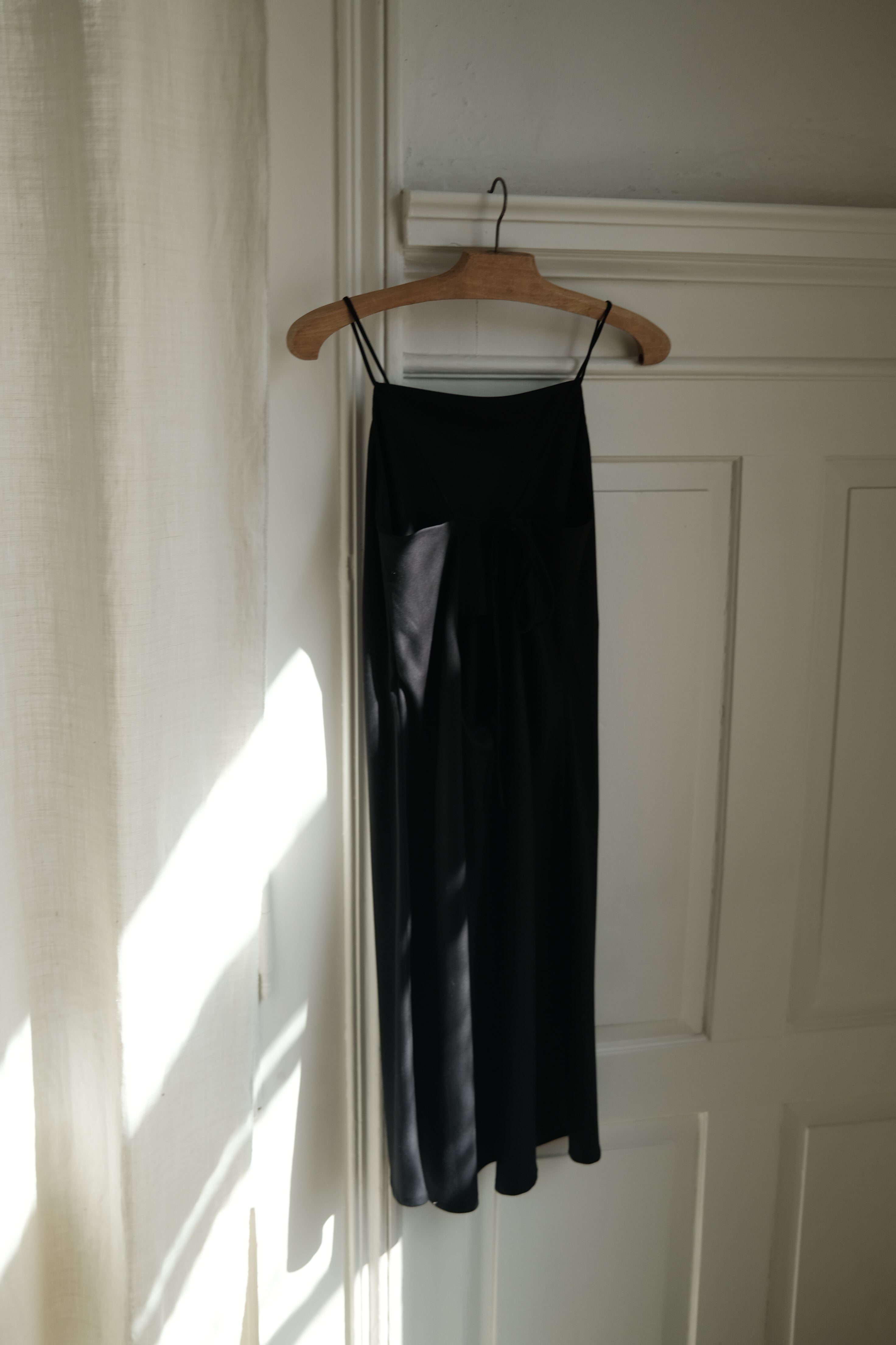 SLIP DRESS, this season's eye-catcher! The fabric gives the dress a perfect drape. It feels very comfortable on your skin and and you can adjust the lenght of the straps to your needs. A deep round open back with the tied straps make make sure you'll turn some heads. The just a bove the knee-length and the simplistic straight neckline in the front, makes it wearable in your every day life. Choose your color and shine bright like a diamond.