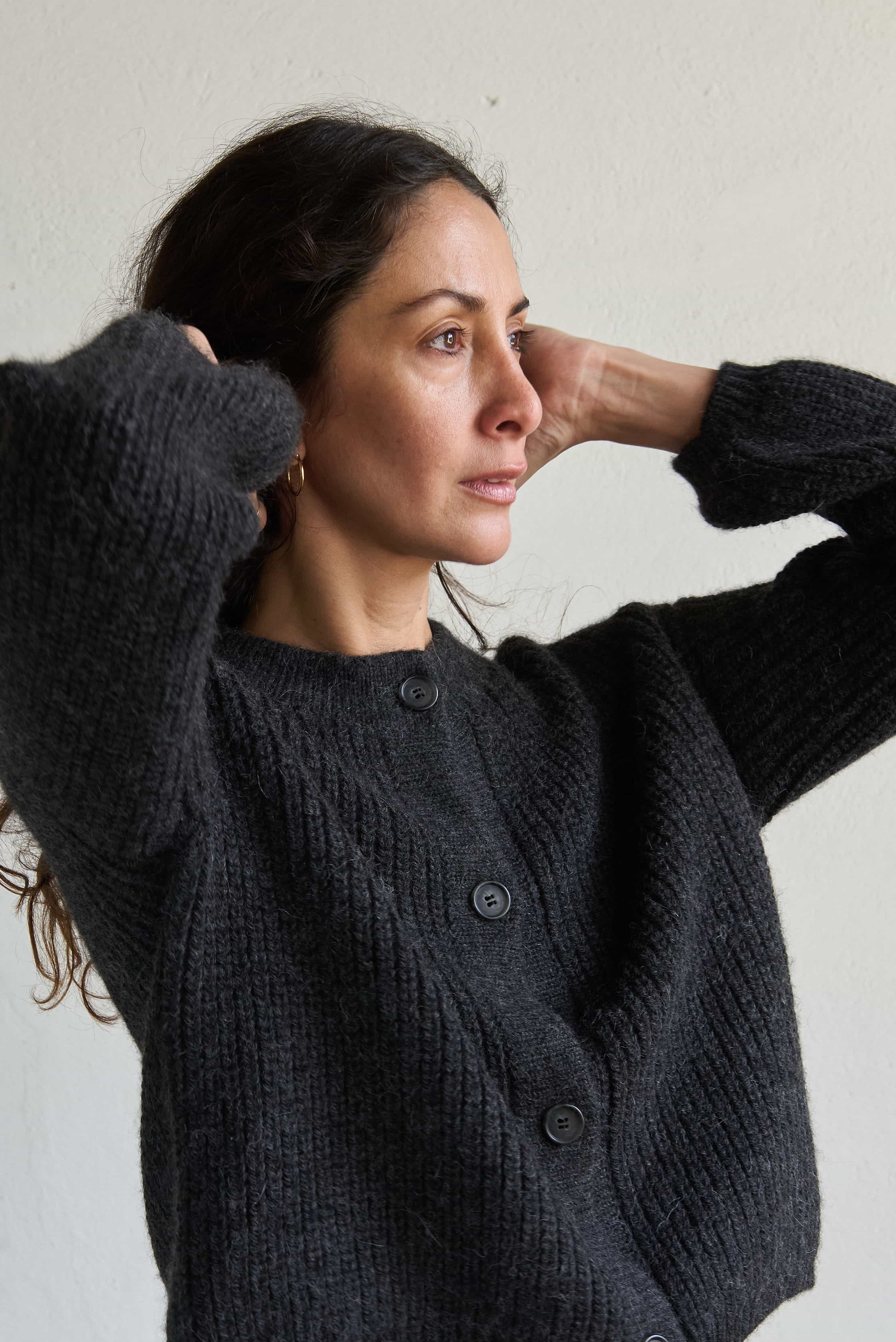 TOSCA CARDIGAN is probably the softest piece you could wish for. Expertly crafted from pure baby alpaca wool, it offers a beautiful drape and irresistible warmth. The buttons are made of recycled paper and resin. Featuring elegant tulip-shaped sleeves, a slightly cropped cut, and a versatile design that can be worn front or back, this chunky-knit cardigan invites you to touch it once—and never let it go.
