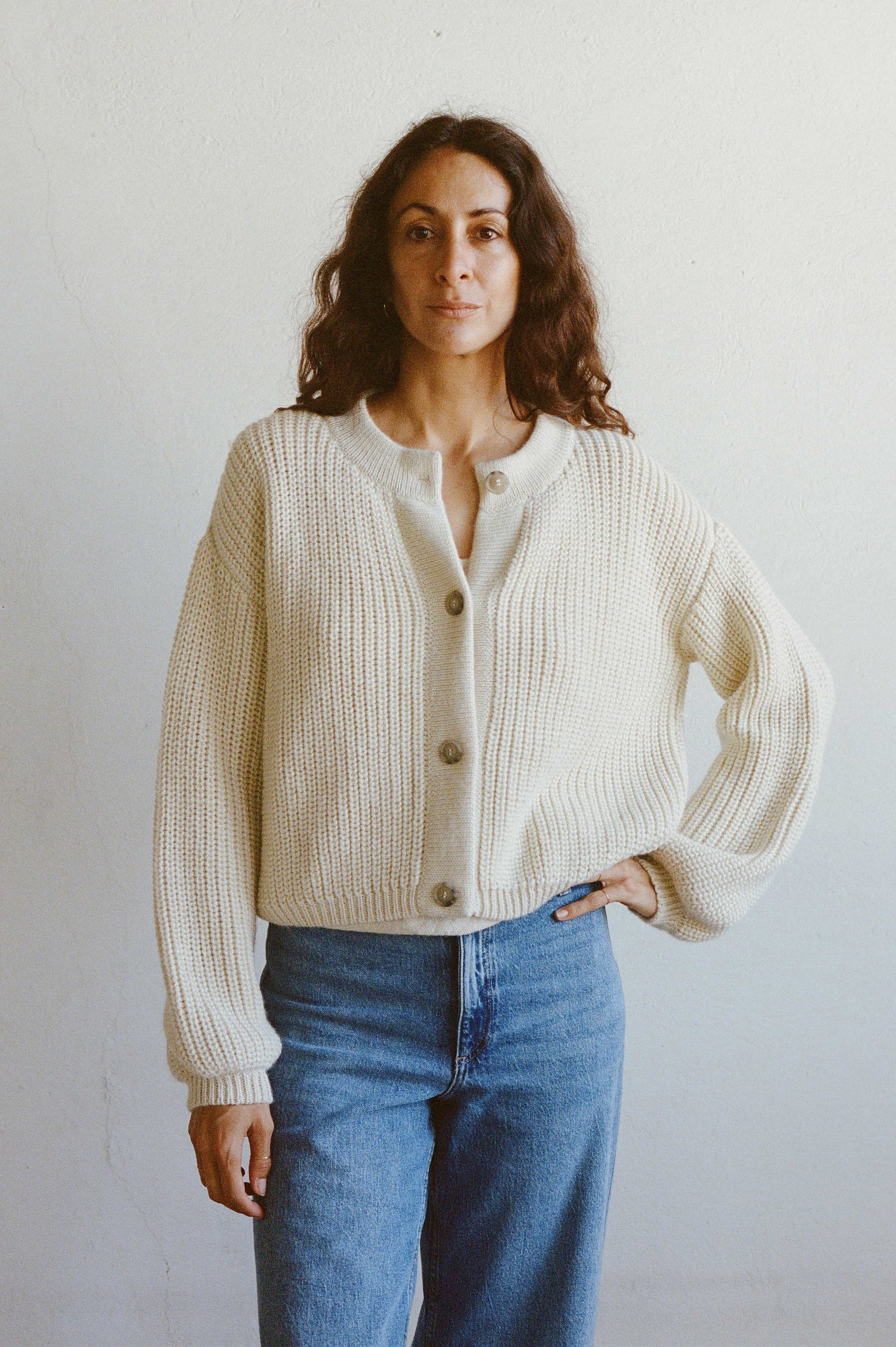 TOSCA CARDIGAN is probably the softest piece you could wish for. Expertly crafted from pure baby alpaca wool, it offers a beautiful drape and irresistible warmth. The buttons are made of recycled paper and resin. Featuring elegant tulip-shaped sleeves, a slightly cropped cut, and a versatile design that can be worn front or back, this chunky-knit cardigan invites you to touch it once—and never let it go.