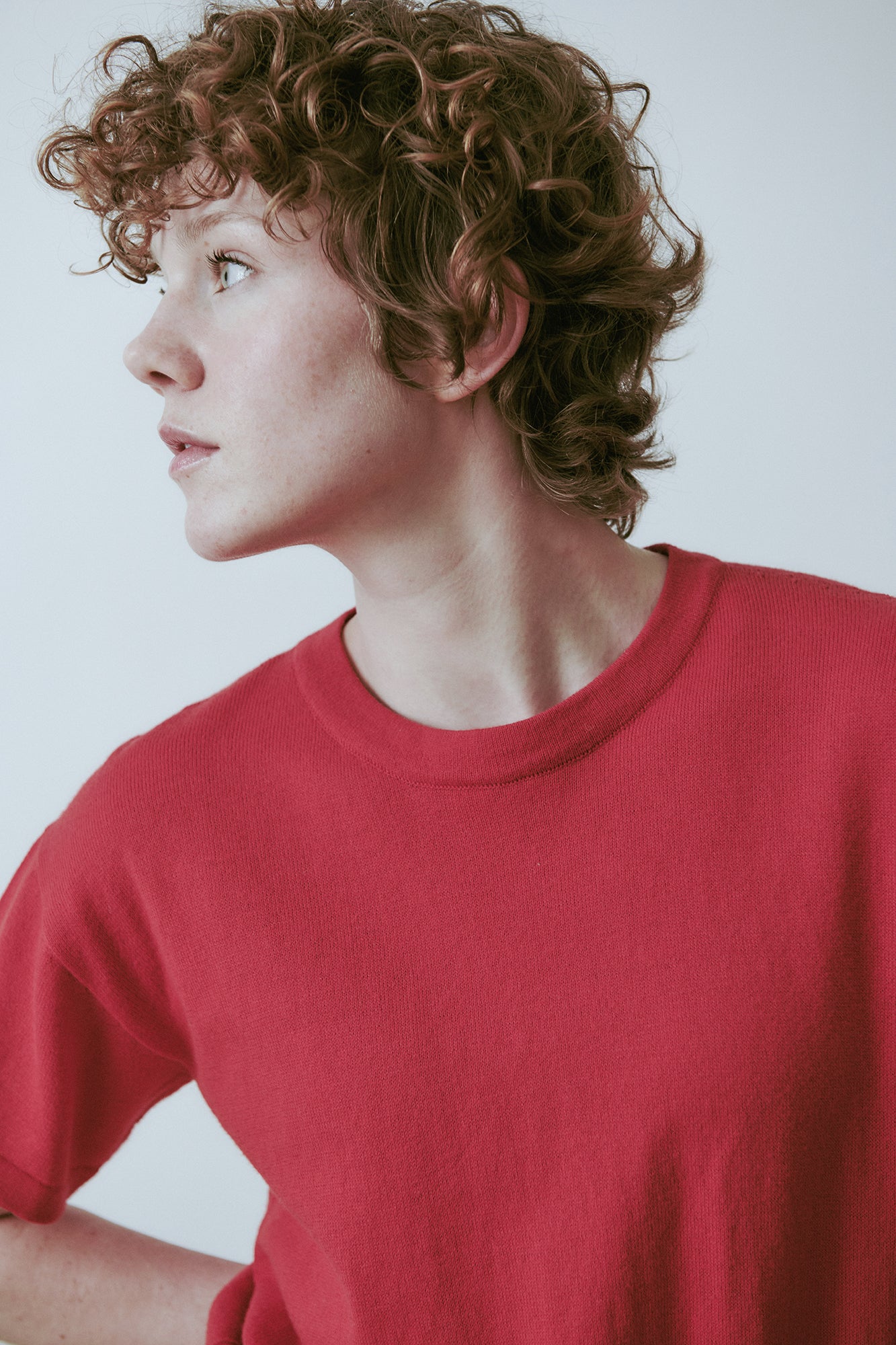 A relaxed knit T-shirt with a universal fit and slightly cropped length. Dropped shoulders and a soft round neckline create an effortless silhouette, while the knit fabric gives the piece a beautiful drape. Finished with a ribbed hemline.