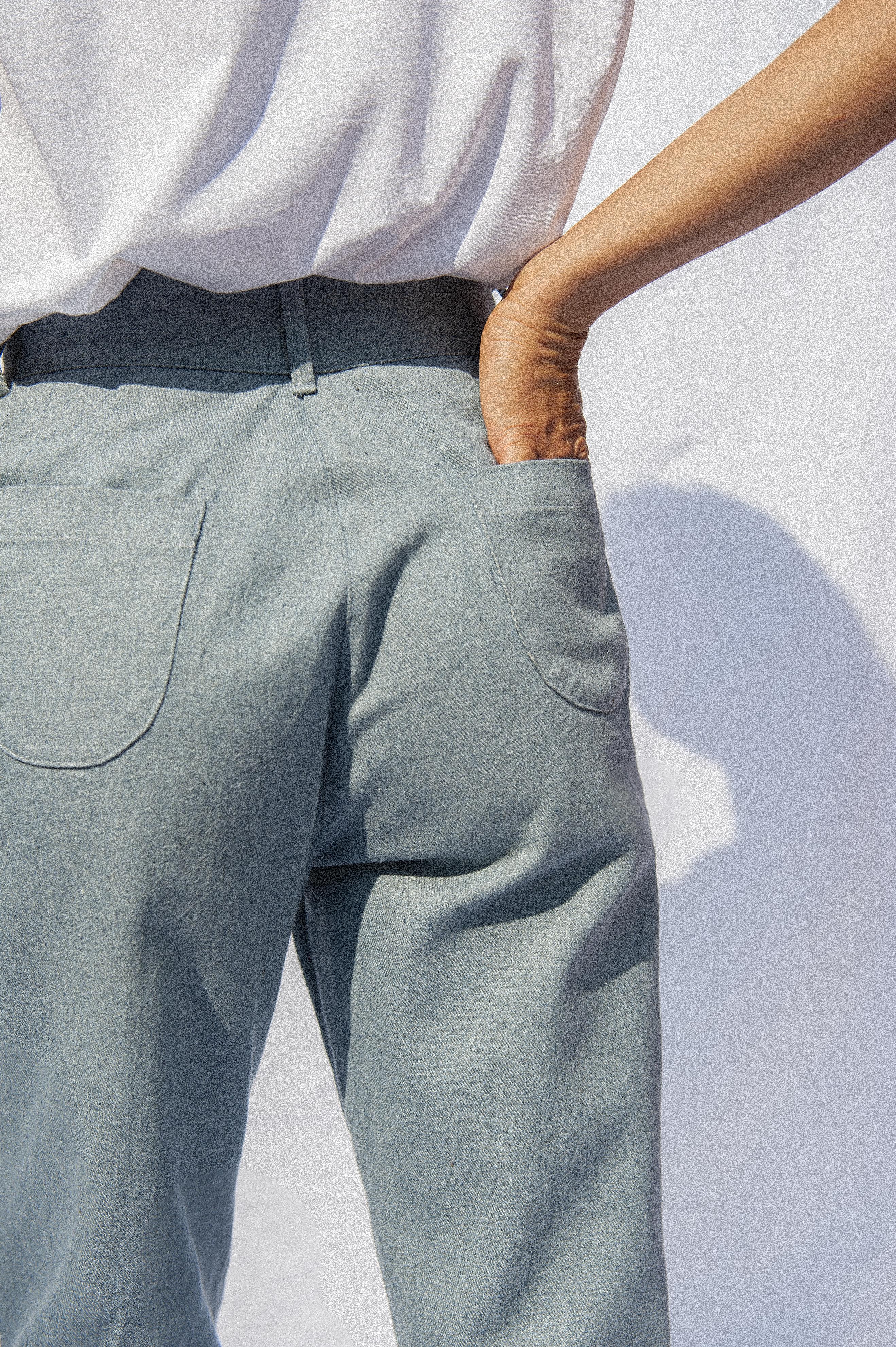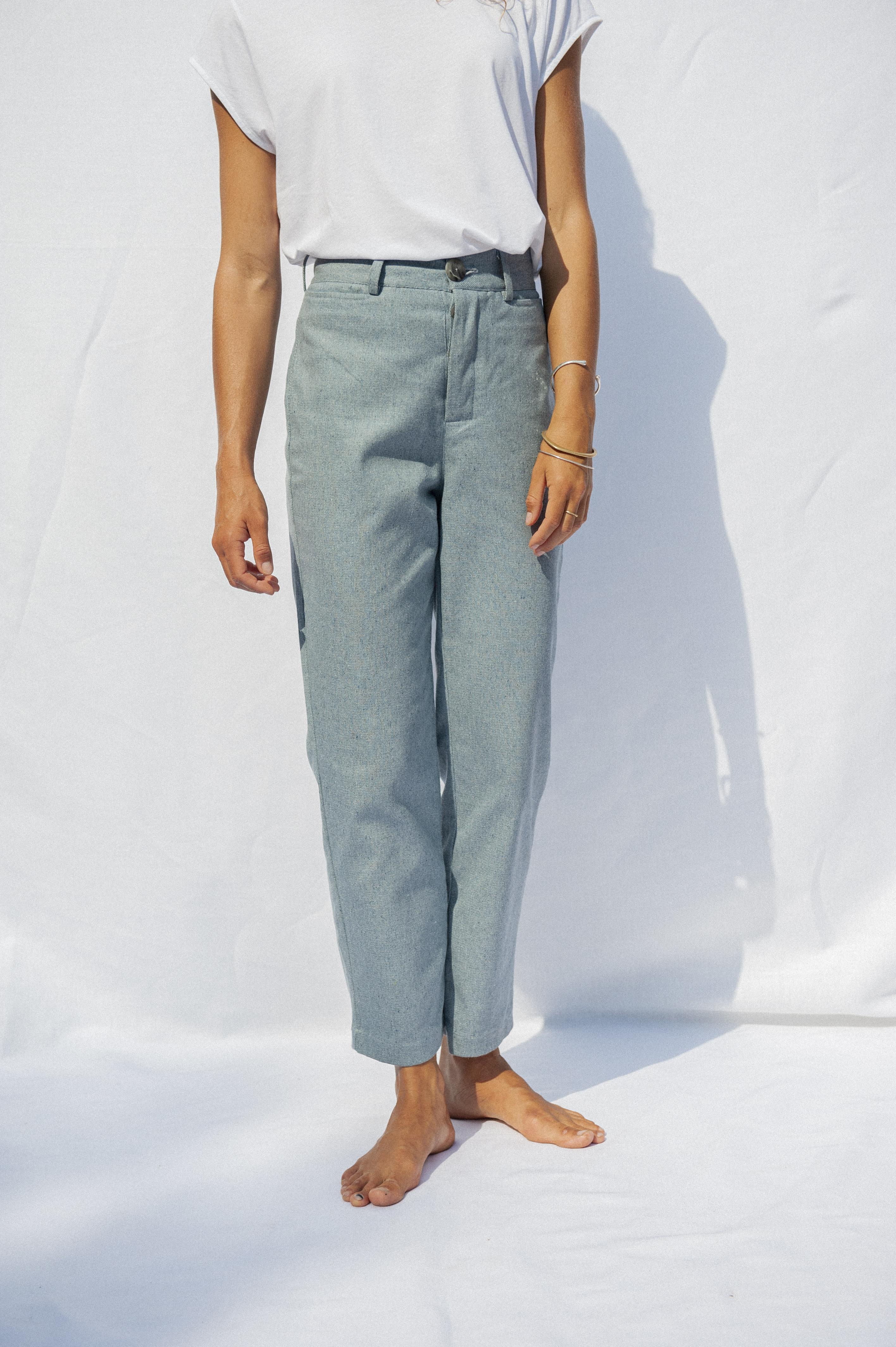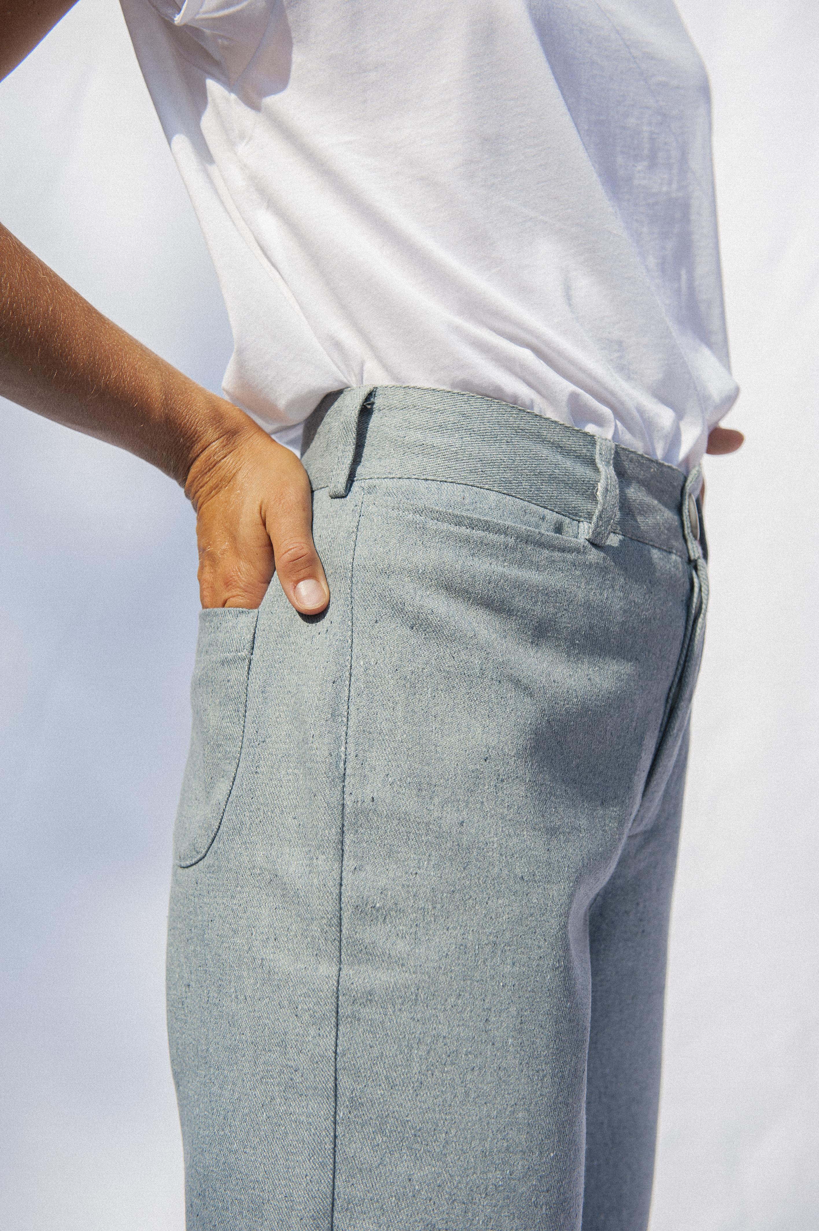 ADA DENIM TROUSERS provide a premium upcycled denim experience that combines comfort and effortless style. Produced in collaboration with The New Denim Project, a family-owned textile manufacturer in Guatemala, these trousers are made from renewed fibers derived from unused jeans and t-shirts. With a timeless high waist, button-up fly, and a generous cut with a summer-fresh hemline, they are perfect for warm weather and various summer occasions.